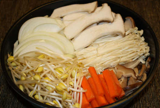 - 전골 냄비 바닥에 배추, 양파를 깔고 그 위로 두부, 버섯류를 보기 좋게 돌려 담습니다.