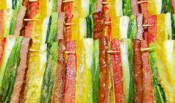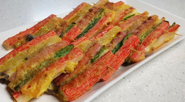 👉 일정한 순서로 꼬치에 꽂아 부치는 음식입니다.