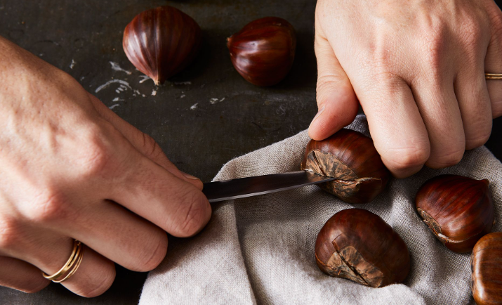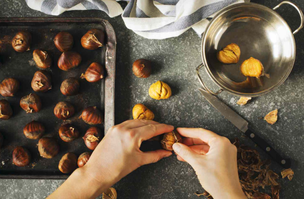 냄비에 물을 끓이고 밤을 넣은 뒤 3분 정도 데칩니다. 그런 다음 건져서 찬물에 바로 담그면 껍질이 팽창과 수축을 반복하면서 느슨해집니다. 이후 칼집을 기준으로 껍질을 잡아당기면 외피와 속껍질이 함께 벗겨집니다.