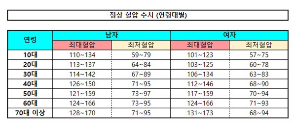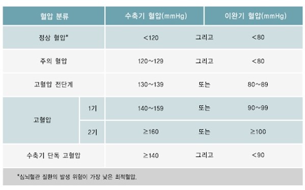정상 혈압수치표 (출처 : 질병관리청)