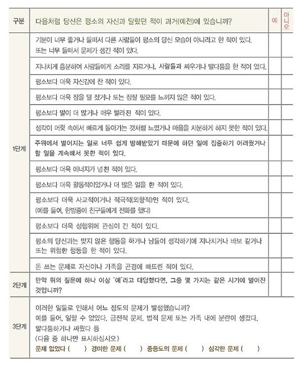 조울증 자가진단 테스트 (출처 : 보건복지부)