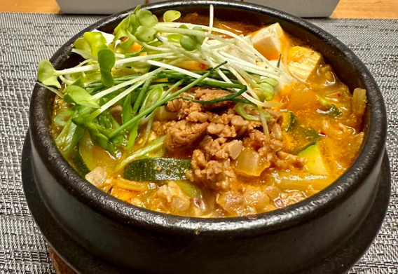 청국장은 발효 과정을 거친 콩으로 만든 전통 음식으로, 특유의 구수한 향과 풍부한 영양이 담겨 있습니다. 청국장 찌개는 이러한 청국장을 국물 요리로 확장한 형태로, 두부, 애호박, 대파, 감자, 양파 등을 넣어 깊은 맛을 내는 것이 특징입니다.